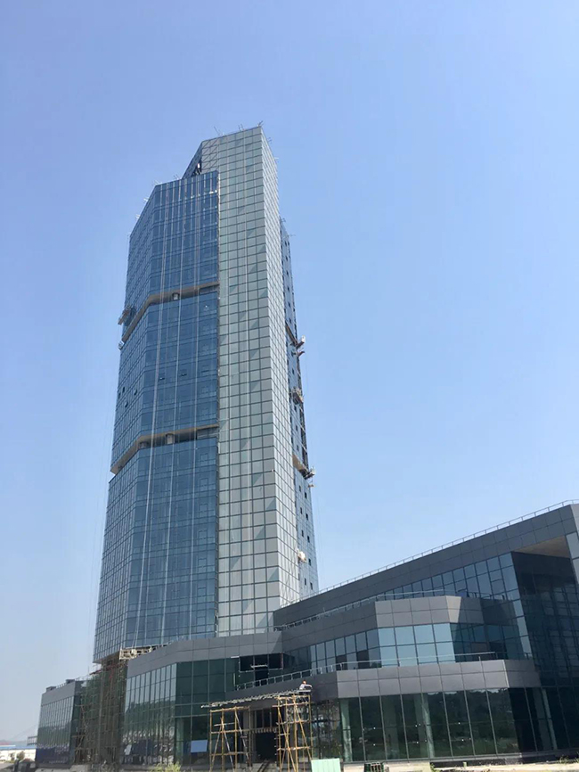 在高99米、建筑層數(shù)25層的宜昌高新區(qū)白洋港口新區(qū)地標(biāo)項(xiàng)目——三峽航運(yùn)大廈大樓上,27名身系安全繩的工人正在16層、19層吊籃上安裝玻璃幕墻。